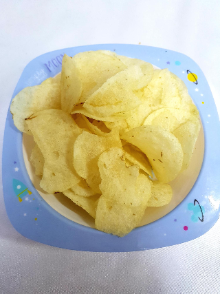 접시에 담아봤어요. 감자칩이 보이네요. 비닐에 그려져 있는 감자칩과는 조금 다르죠?