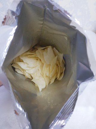 과자에 보이는 검은 반점은 감자 껍질이라고 해요. 감자 그대로 썰어서 튀긴 거라 껍질이 들어갈 수도 있답니다.