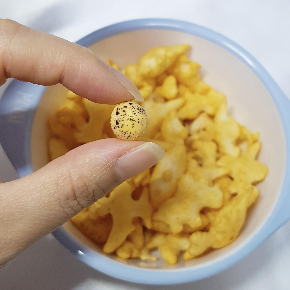 그다음은 티라노사우르스, 프테라노돈, 스피노사우르스, 악어 모양은 이름을 모르겠네요. 그리고 이 과자의 핵심인 공룡알이 들어있어요. 과자에는 양념 시즈닝이 뿌려져 있어요. 맛은 캠핑 소시지 맛이래요. 고래밥인데 모양이 다르다고 보시면 돼요. 공룡 사랑 아들은 열심히 육식 공룡을 잡아먹었어요. 저 공룡알은 초콜릿 같은 느낌인데 생각보다 과자랑 잘 어울려요. 간쪼도 처음엔 별로일 거라 생각했는데 먹어보니 맛있더라고요. 근데 봉지 당 3개 정도밖에 안 들어 있어요. 원재료명을 보니 마시멜로우 인 것 같아요.